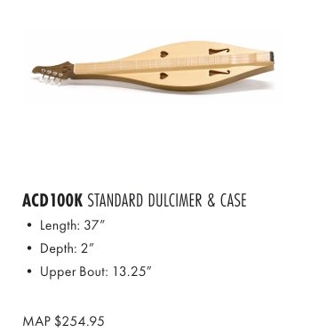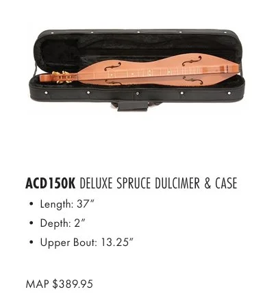 Shop Categories: Select a Category Mandolin Fiddle Dulcitar Banjo Guitar Dulcimer Mandolin | Fiddle | Dulcitar | Banjo | Guitar | Dulcimer | Scroll head Hourglass Dulcimer $499.00 Apple Creek Dulcimer Sale Price: $349.99 Original Price: $389.99 Sale Apple Creek Dulcimers Sale Price: $249.99 Original Price: $279.99 Sale Apple Creek Dulcimers Sale Price: $449.99 Original Price: $479.95 Sale Amplified Acoustic Cigar Box Guitars Sale Price: $169.99 Original Price: $179.99 Sale Cigar Box Banjo Sale Price: $159.99 Original Price: $179.99 Sale Beginners custom built Walnut Box Dulcimer. (Copy) Sale Price: $299.99 Original Price: $349.99 Sale Gift card from $25.00